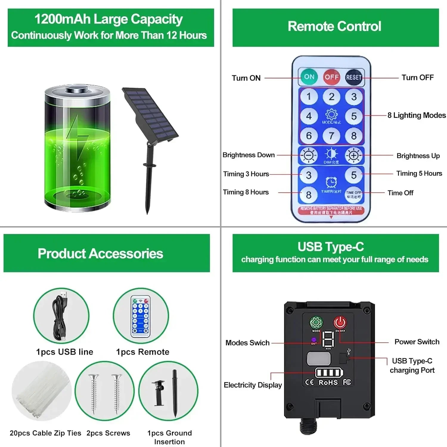 - 【High Battery Capacity & Safe】The solar string lights with 300pcs low-heat-emission LED bulbs, up to 19% high energy conversion rate comparing to others’ 13%. The solar fairy lights can work continuously for more than 12 hours at night if the panel absorbs enough sunshine during day. Meanwhile the fairy string lights is environmental friendly and energy efficient. The lights will not overheat after using many hours, so they are durable and safe to use.
