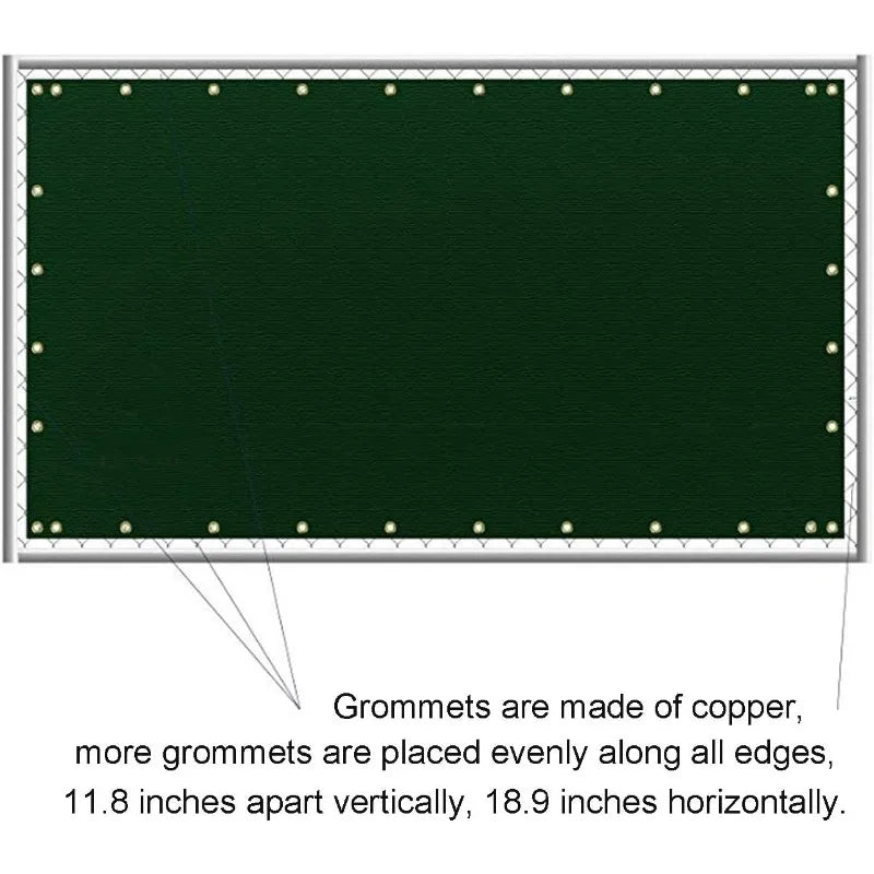 More intensive grommets: Grommets are made of copper, more grommets are placed evenly along all edges, 11.8 inches apart vertically, 18.9 inches horizontally. All edges are covered with black reinforced 1.3" binding. The grommets and bindings help the screen to hold up in the wind.
