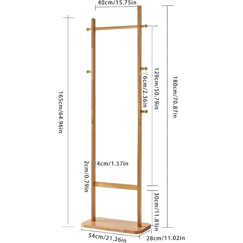 - STABLE AND STURDY: The coat rack is made of solid rubber wood, with base size 54x28x2.5cm that is thick and heavy duty, make sure sturdiness with load-bearing 8 lb each hook, 20 lb for top rod and 22 lb on main rods' top