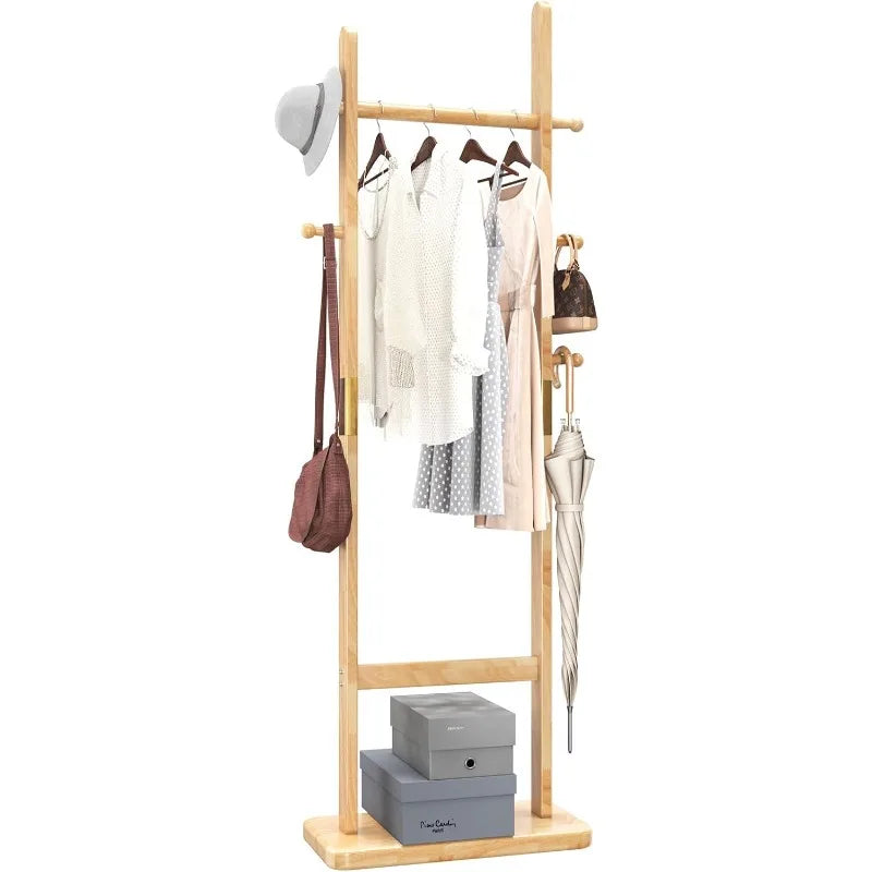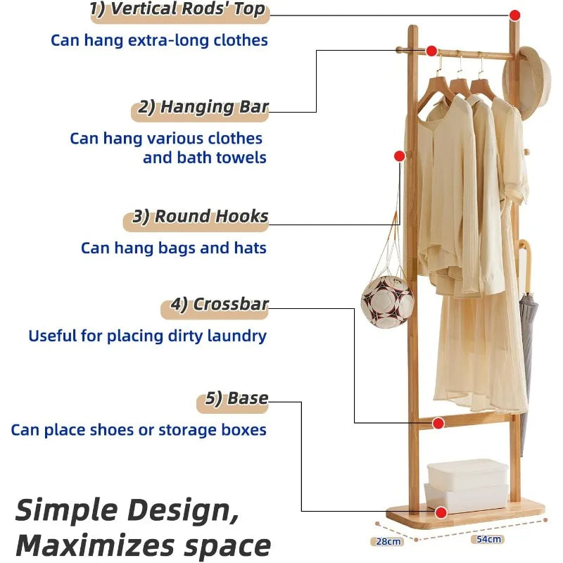 - LARGE CAPACITY: This freestanding coat hanging rack can hold 10-15 clothes on top rod with coat hangers, and has 2 main rods' top for super long and heavy coats, bottom crossbar to place dirty laundry, rectangular base for shoes or storage boxes, 5 round hooks can hang hat purse schoolbag and basketball etc.