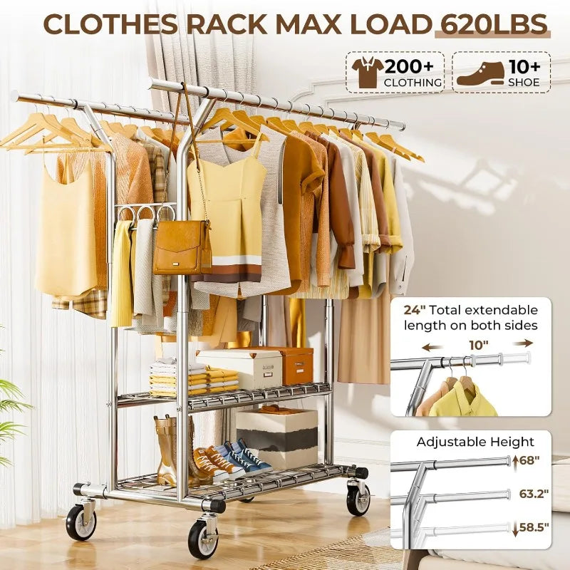 【620 LBS Capacity Rolling Clothing Rack】:heavy duty clothes rack is solid and sturdy enough to hold up to 620 LBS. (400 LBS on the double hanging rods. 220 LBS on the bottom shelves for shoes and luggage storage.) It can meet all your extra clothes storage needs