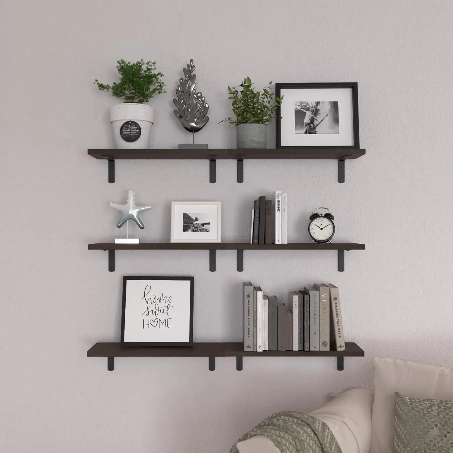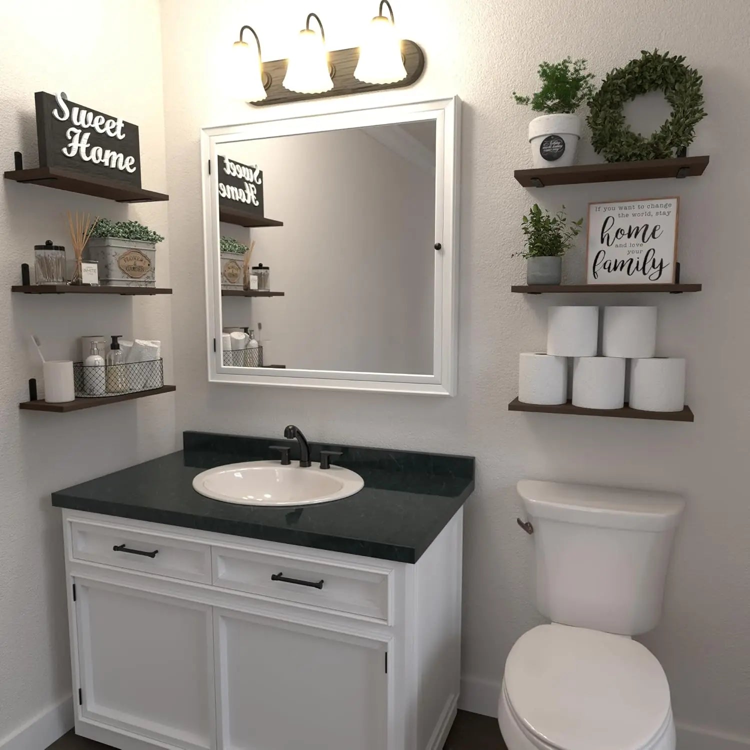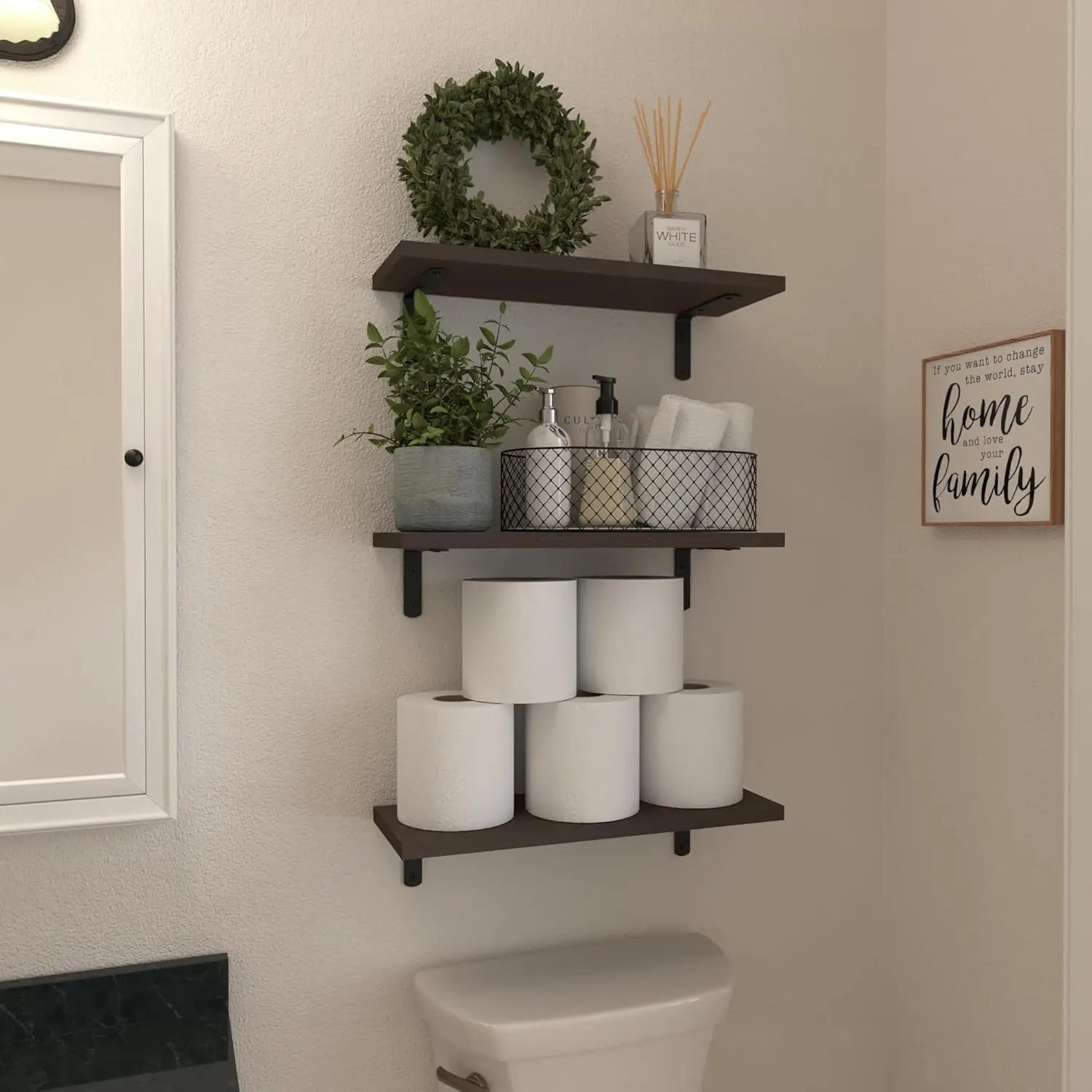 Sturdy & Easy to Assemble- The L-shaped metal brackets are durable, with a capacity of 40Lb. You don't need to worry about it falling off. wood floating wall shelves for bathroom are super sturdy, very easy to install, and less damage to the wall. No need to worry about stability. Just put your items on, and our wall shelves can bear the weight of your love.